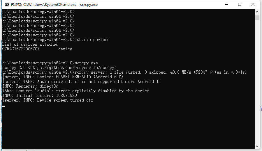 Connect your phone to the computer via USB, open the command prompt and navigate to the scrcpy folder directory.